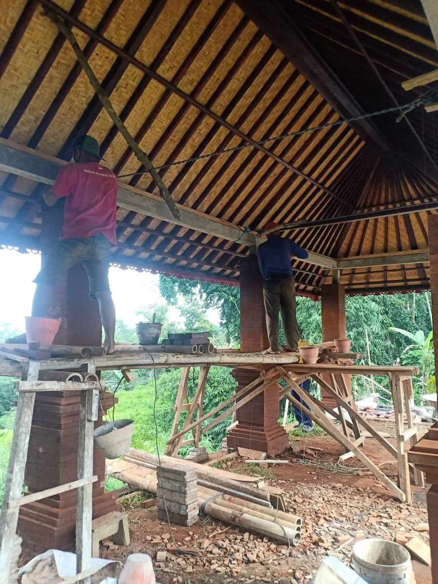 The team hard at work on a traditional Balinese roof for our outdoor dining area.